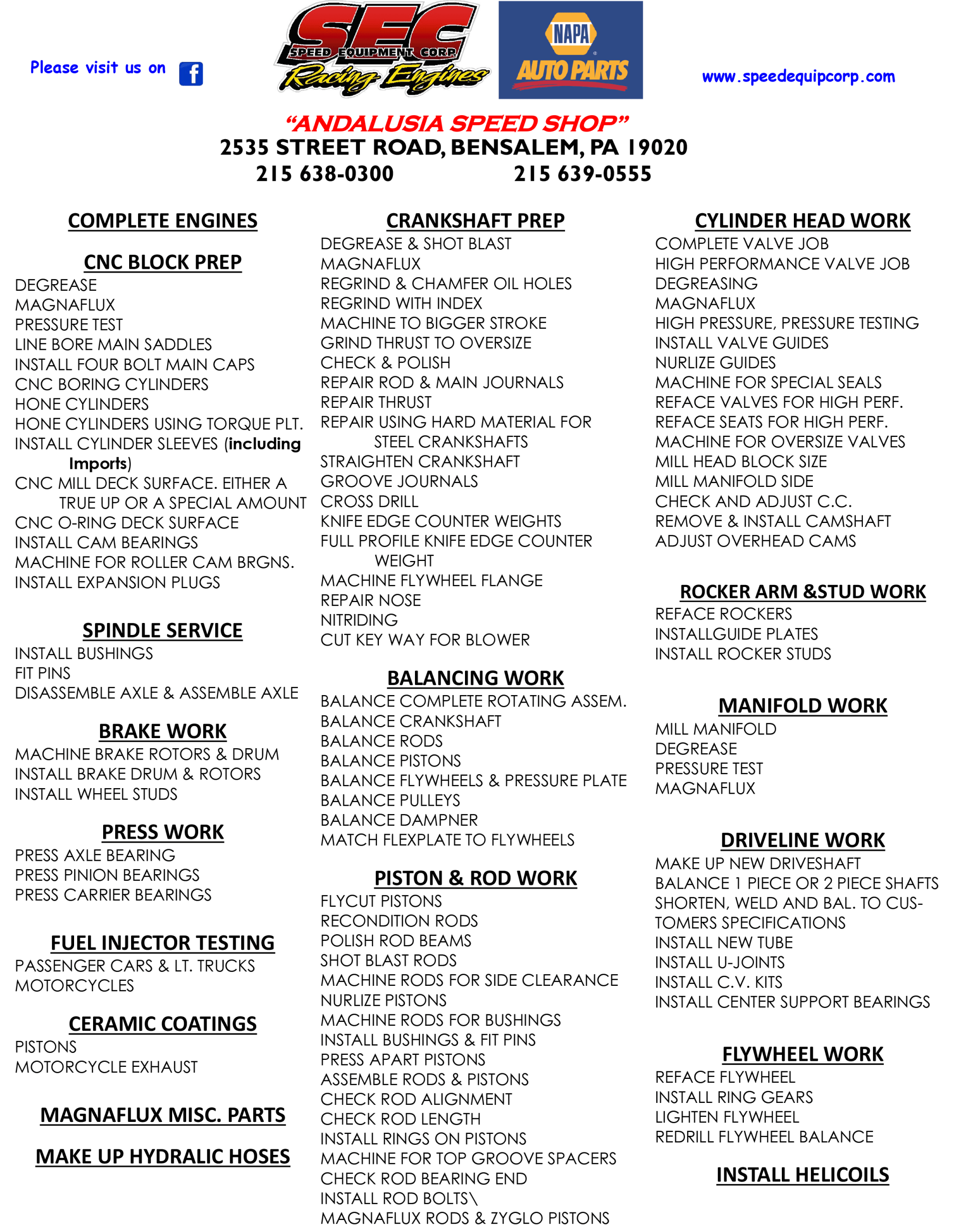 Speed Equipment Corp - NAPA Auto Parts is honored to serve areas around Bensalem, PA with quality automotive parts and tools. We work hard to be the best auto parts store. Our automotive professionals always strive to provide our customers honest, efficient and friendly service. We also carry top brands that will suit your needs. Please contact us if you need automotive or car repair parts and tools.